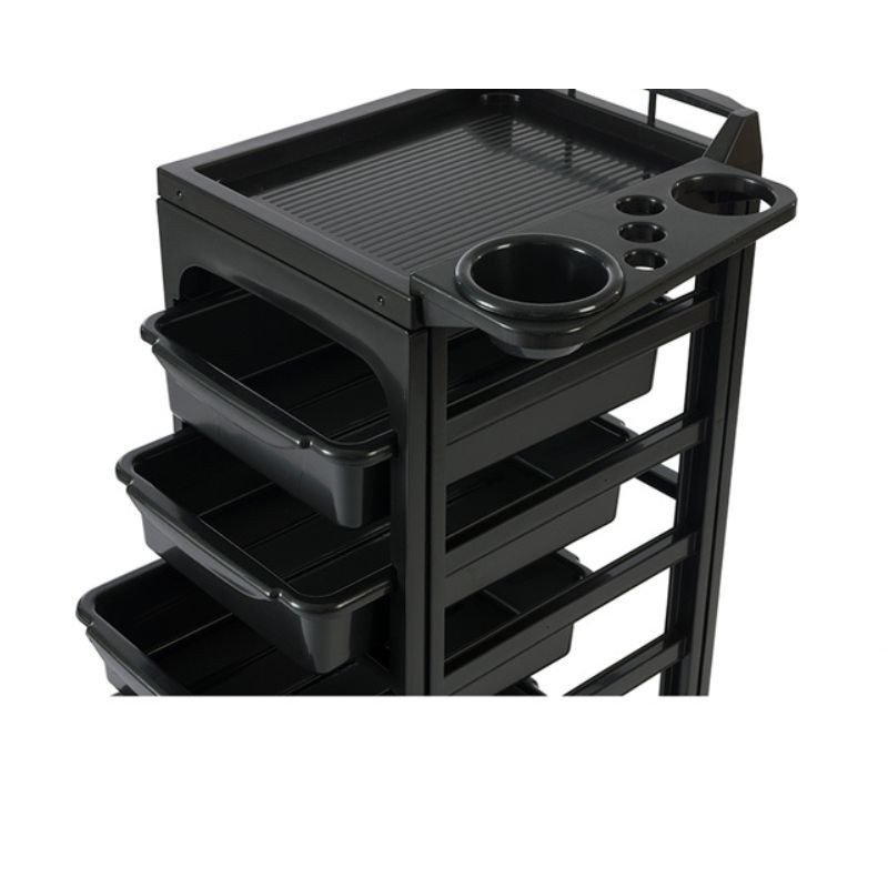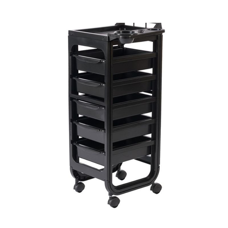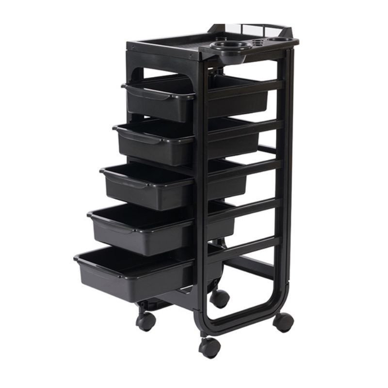 Tämä mustapäällinen kampaamovälinekärry on täydellinen, jos haluat nopeasti saatavilla olevan paikan kampaamovälineille tai -välineille.